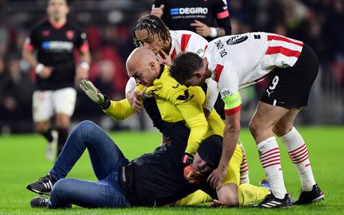 Follia nel finale di Psv Eindhoven-Siviglia, sfida vinta 2-0 dagli olandesi ma eliminati nel playoff di Europa League dopo lo 0-3 in Spagna. Un tifoso olandese entra in campo e cerca di aggredire Marko Dmitrovic. Grande lucidità e reattività del portiere ospite, che immobilizza l'invasore e favorisce l'intervento degli steward. "Meglio che non dica cosa avrei voluto fargli"