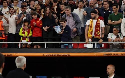 Mourinho regala la medaglia dellEuropa League a un giovane tifoso giallorosso