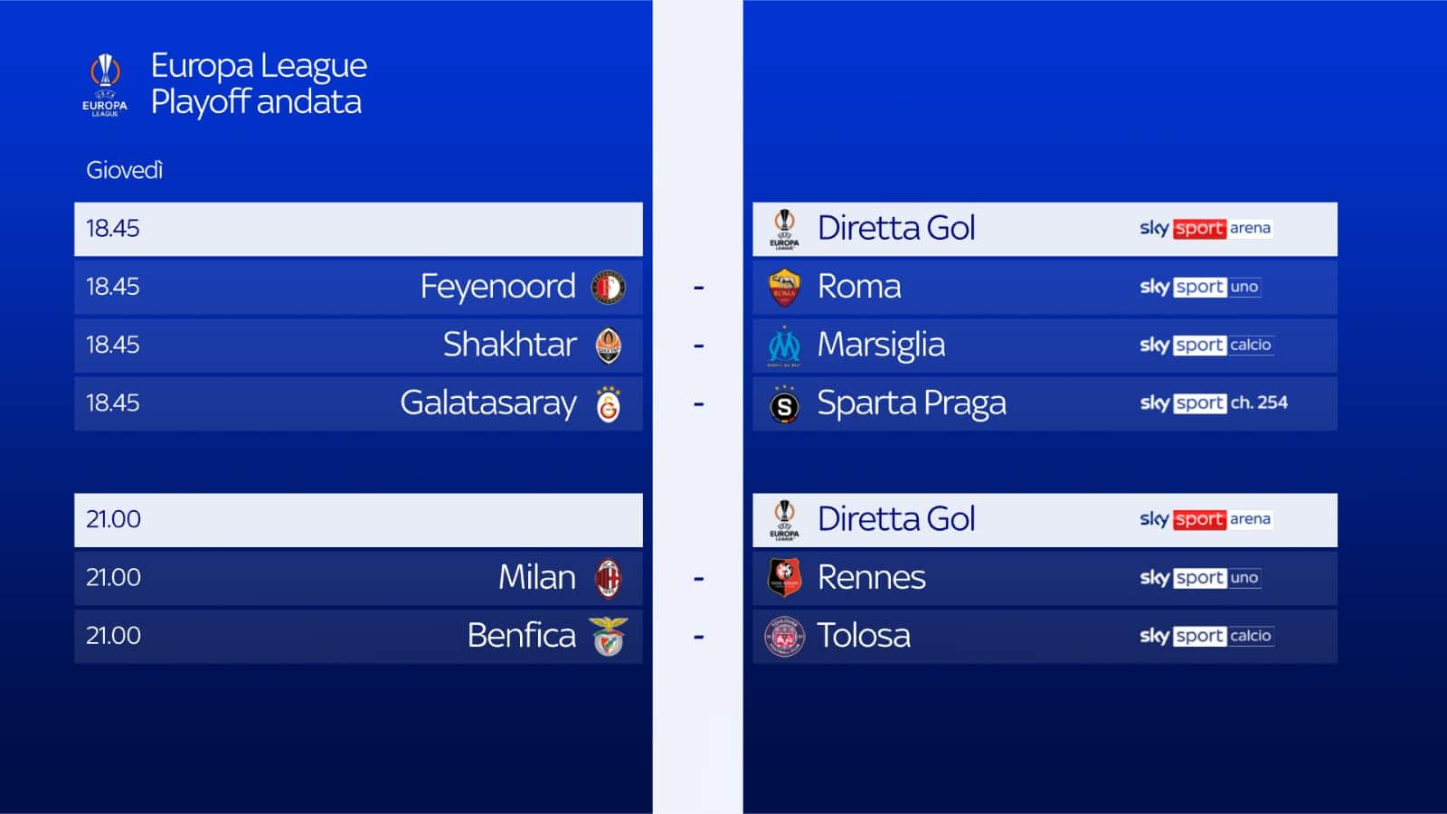 - ore 21.00: Benfica-Tolosa su Sky Sport Calcio, Sky Sport 253 e NOW. Telecronaca di Dario Massara. Diretta Gol Filippo Benincampi.