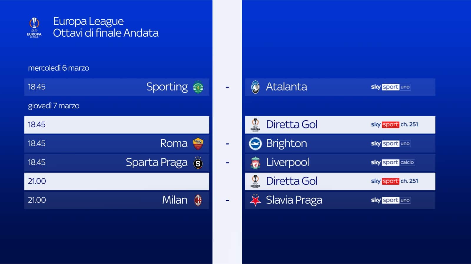- ore 18.45: Sparta Praga-Liverpool su Sky Sport Calcio, Sky Sport 253 e NOW. Telecronaca di Nicola Roggero. Diretta Gol Paolo Ciarravano.