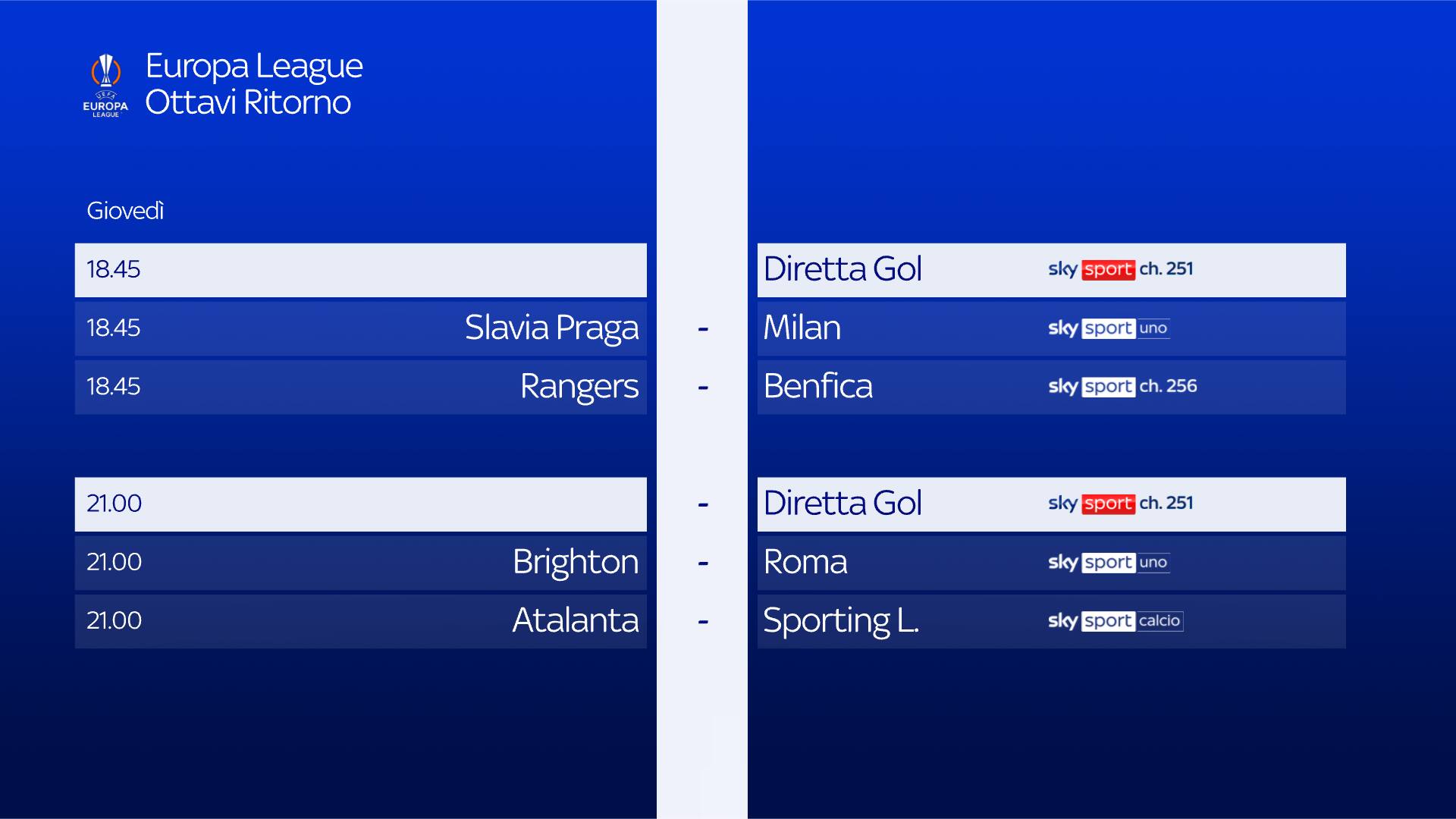 guida tvRitorno degli ottavi di finale dell'Europa League: il Milan gioca in trasferta stasera, giovedì 14 marzo alle ore 18.45 contro lo Slavia Praga, in diretta su Sky, canali Sky Sport Uno, Sky Sport 253 e in streaming su NOW