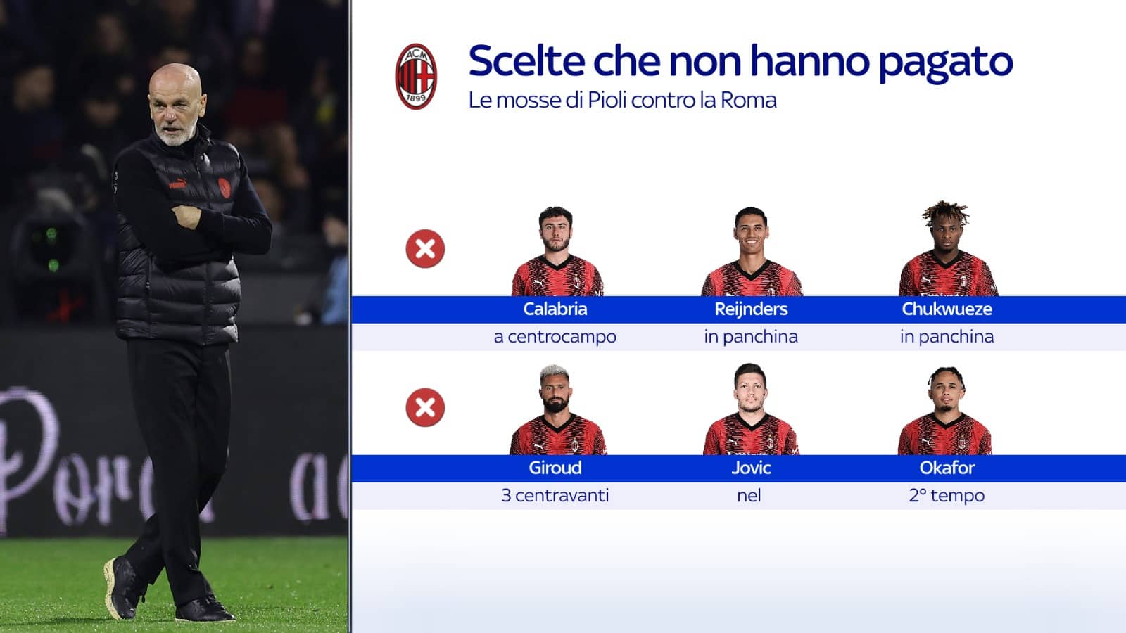 All'Olimpico, i giocatori più rappresentativi hanno clamorosamente bucato l'appuntamento. Da Leao a Theo Hernandez, da Giroud a Loftus-Cheek. E gli azzardi di Pioli, più che portare benefici, hanno generato grande confusione. Calabria a centrocampo, Reijnders in panchina e Musah terzino, uno dei pochi a strappare comunque la sufficienza. 5 attaccanti e 3 centravanti a pestarsi i piedi tutti insieme nel secondo tempo. Chukwueze fuori dall'undici iniziale, l'unico lì davanti, tra andata e ritorno, che sembrava avere lo spunto giusto per mettere in difficoltà la Roma. Tutte scelte che non hanno pagato e che Pioli quasi certamente pagherà. Comunque vada, tra derby e Juventus, il destino, mai come oggi, sembra segnato.