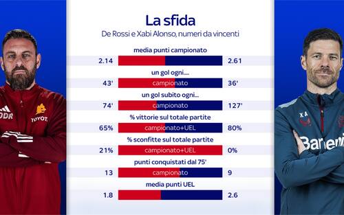 - Entrambi ex centrocampisti, si sfideranno per la prima volta in panchina. Xabi Alonso ha vinto la sua prima Bundesliga da allenatore e ha statistiche migliori rispetto a De Rossi, subentrato a stagione in corso: la media punti in campionato, infatti, è di 2.61 contro i 2.14, mentre in Europa League è 2.6 rispetto all'1.8 di DDR. Relativamente ai gol, invece, il Bayer segna una rete ogni 36' e ne subisce una ogni 127', mentre i giallorossi segnano una volta ogni 43' e subiscono ogni 74 '.