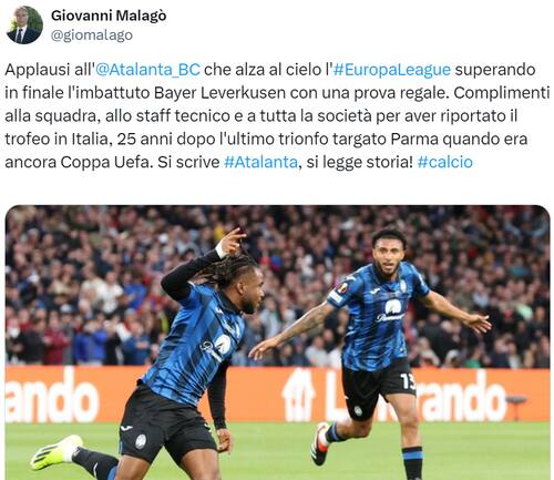 - "Si scrive Atalanta, si legge storia!". Non si sono fatti attendere i complimenti del numero 1 del Coni Giovanni Malagò. L'Atalanta è la prima squadra italiana a conquistare l'Europa League, da quando ha assunto la nuova denominazione