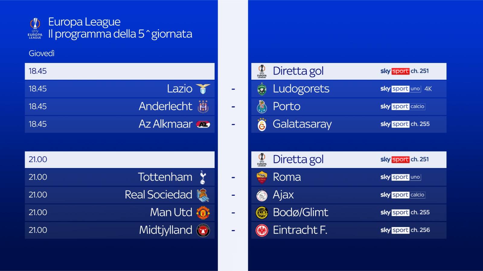 - ore 18.45: LAZIO-LUDOGORETS su Sky Sport Uno, Sky Sport 252, Sky Sport 4K e in streaming su NOW. Telecronaca Davide Polizzi, Diretta Gol Luca Marchegiani, bordocampo Matteo Petrucci e Manuele Baiocchini, Diretta Gol Daniele Barone.