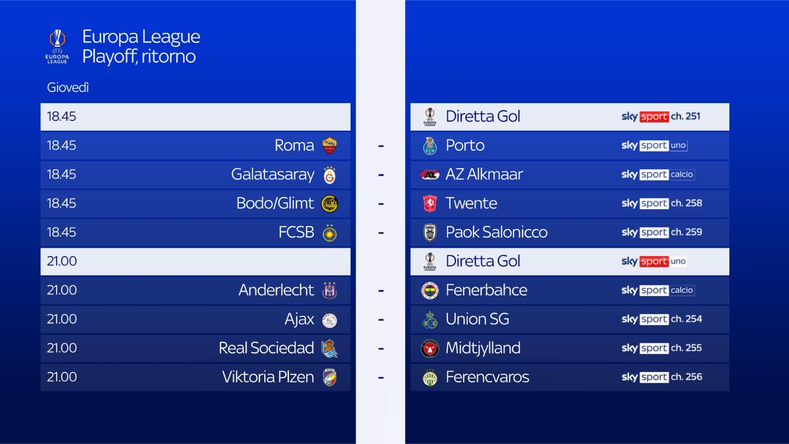 guida tvRitorno dei playoff di Europa League: oggi, giovedì 20 febbraio, alle 18.45 la Roma è impegnata all'Olimpico con il Porto. L’incontro sarà visibile su Sky Sport Uno, Sky Sport 252, Sky Sport 4K e in streaming su NOW. Appuntamento anche con Diretta Gol per seguire le partite in contemporanea delle 18.45 e delle 21
