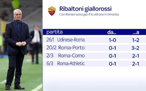 La Roma ha battuto in rimonta l'Athletic Bilbao in Europa League. E' il quarto ribaltone con successo da quando Claudio Ranieri siede sulla panchina giallorossa tra Europa League e Serie A. Ecco i precedenti, partendo proprio dall'ultimo in Europa