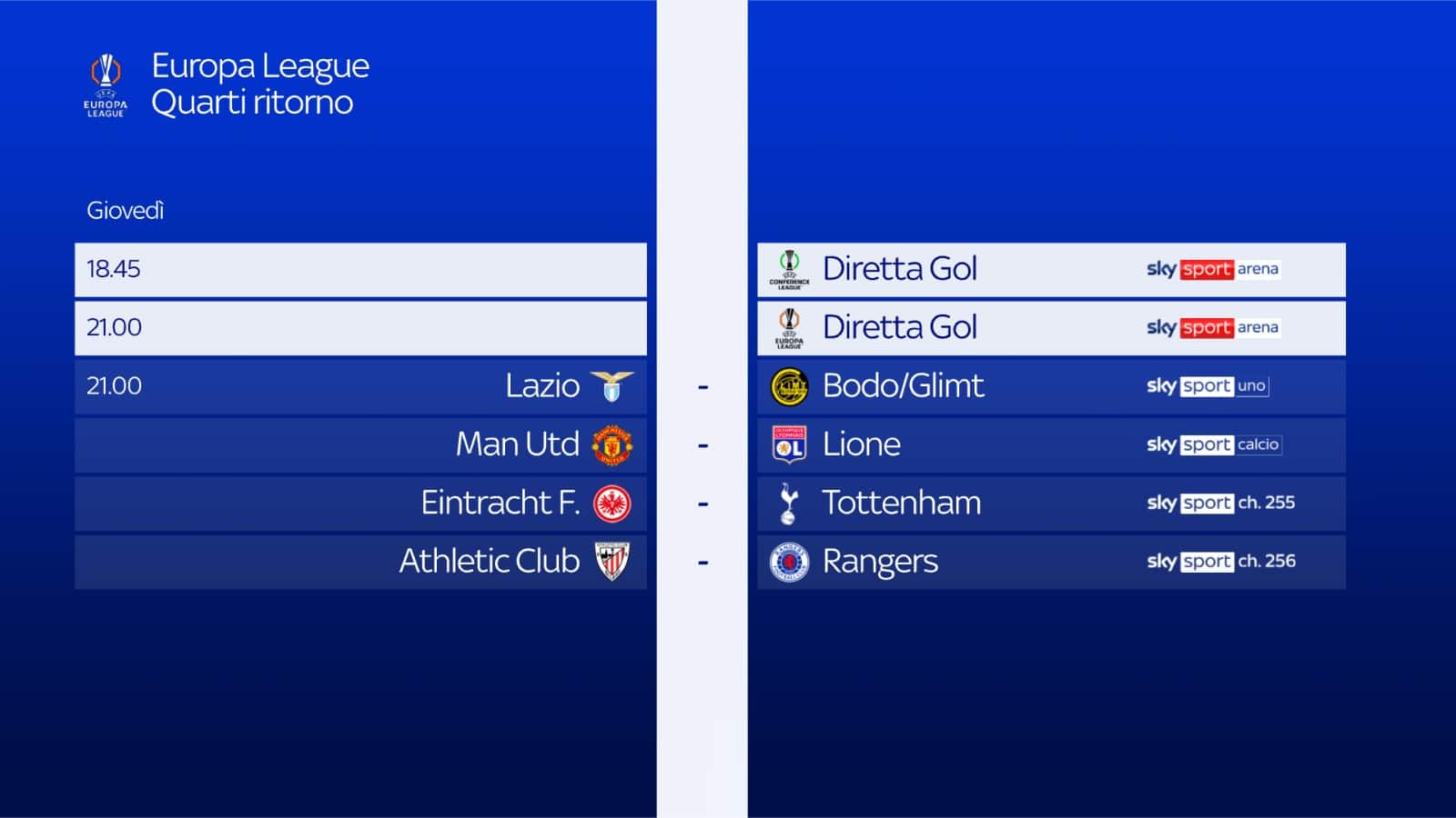 - ore 21.00: ATHLETIC BILBAO-RANGERS su Sky Sport 256 e in streaming su NOW. Telecronaca Antonio Nucera, Diretta Gol Filippo Benincampi