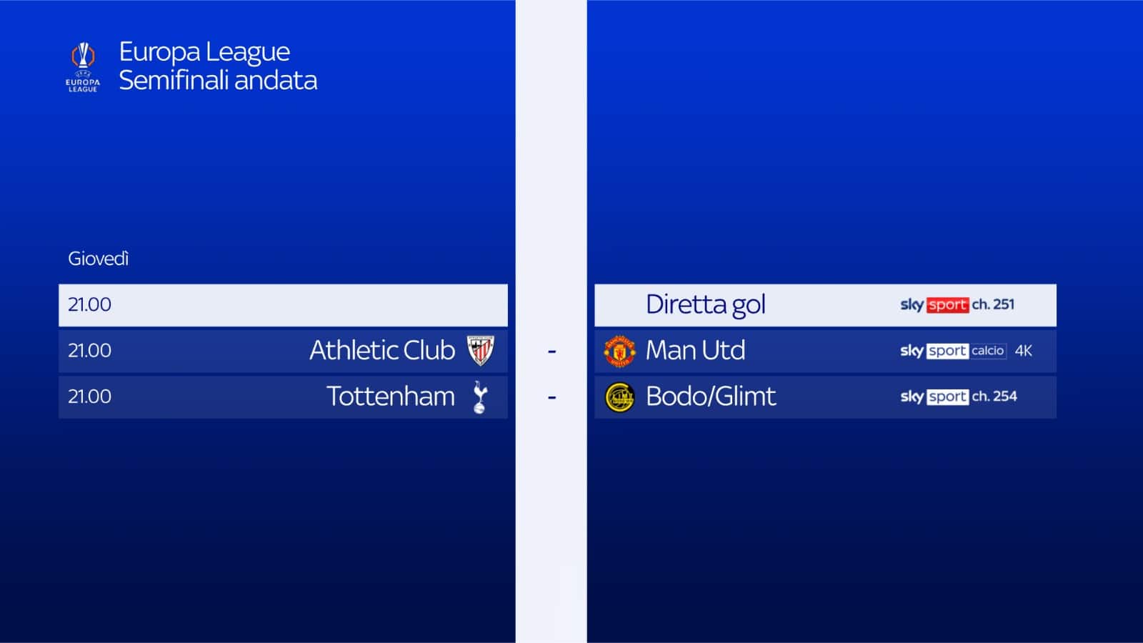 - ore 21.00: ATHLETIC BILBAO-MANCHESTER UNITED su Sky Sport Calcio, Sky Sport 253, Sky Sport 4K e in streaming su NOW. Telecronaca Nicola Roggero, commento Giancarlo Marocchi; bordocampo Valentina Mariani, Diretta Gol Riccardo Gentile