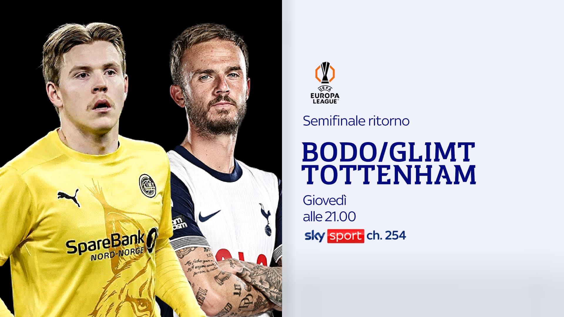Oggi, giovedì 8 maggio, alle ore 21 il Bodo Glimt ospita il Tottenham per la semifinale di ritorno di Europa League. L’incontro sarà visibile su Sky Sport 254 e in streaming su NOW. Telecronaca Davide Polizzi. Diretta Gol con Daniele Barone. Dalle 20 e dalle 23 da non perdere su Sky Sport Uno, Sky Sport 24 e NOW lo Studio Europa League con Mario Giunta, Beppe Bergomi, Marco Bucciantini e Andrea Marinozzi. Spazio news con Vittoria Orlando. Alle 21 spazio anche a Diretta Gol per le partite in contemporanea su Sky Sport Arena, Sky Sport 251 e in streaming su NOW.