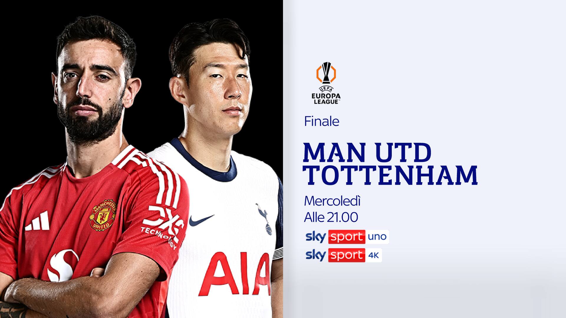 Oggi, mercoledì 21 maggio alle ore 21 il Manchester United scende in campo contro il Tottenham allo stadio San Mamés di Bilbao per la finale di Europa League. L’incontro sarà visibile su Sky Sport Uno, Sky Sport 251, Sky Sport 4K e in streaming su NOW. Telecronaca Stefano Borghi, commento Blerim Dzemaili. A bordocampo Filippo Benincampi. Sky seguirà minuto per minuto l’avvicinamento alla partita con collegamenti tutto il giorno live su Sky Sport 24 e con gli studi dedicati pre e post-partita, a partire dalle 20, su Sky Sport Uno, Sky Sport 24 e NOW con lo Studio Europa League con Mario Giunta, Beppe Bergomi, Marco Bucciantini, Andrea Marinozzi. Spazio news con Vittoria Orlando.