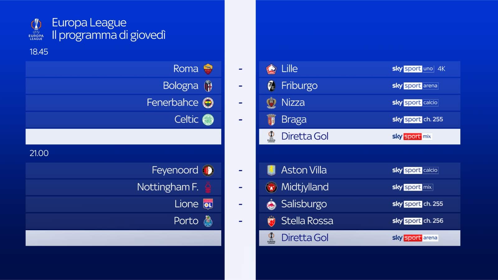 - alle 18.45: BOLOGNA-FRIBURGO su Sky Sport Arena, Sky Sport 253 e in streaming su NOW. Telecronaca Paolo Ciarravano, commento Giancarlo Marocchi, Diretta Gol Federico Botti. Inviati Marco Nosotti e Niccolò Omini