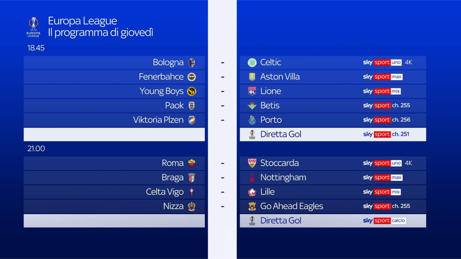 - alle 18.45: BOLOGNA-CELTIC su Sky Sport Uno, Sky Sport 252, Sky Sport 4K e in streaming su NOW. Telecronaca Paolo Ciarravano, commento Giancarlo Marocchi, inviati Marco Nosotti e Filippo Benincampi, Diretta Gol Dario Massara