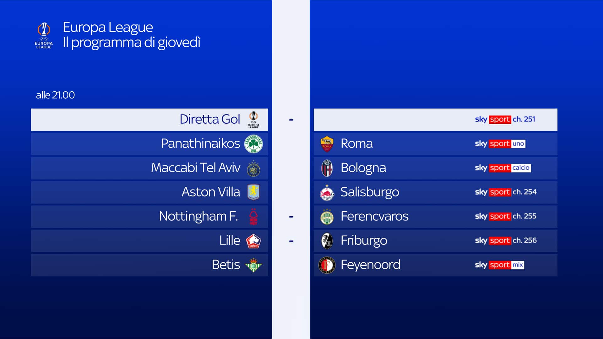 - alle 21.00: BETIS-FEYENOORD su Sky Sport Mix, Sky Sport 257 e in streaming su NOW. Telecronaca Giovanni Rispoli, Diretta Gol Matteo Marceddu