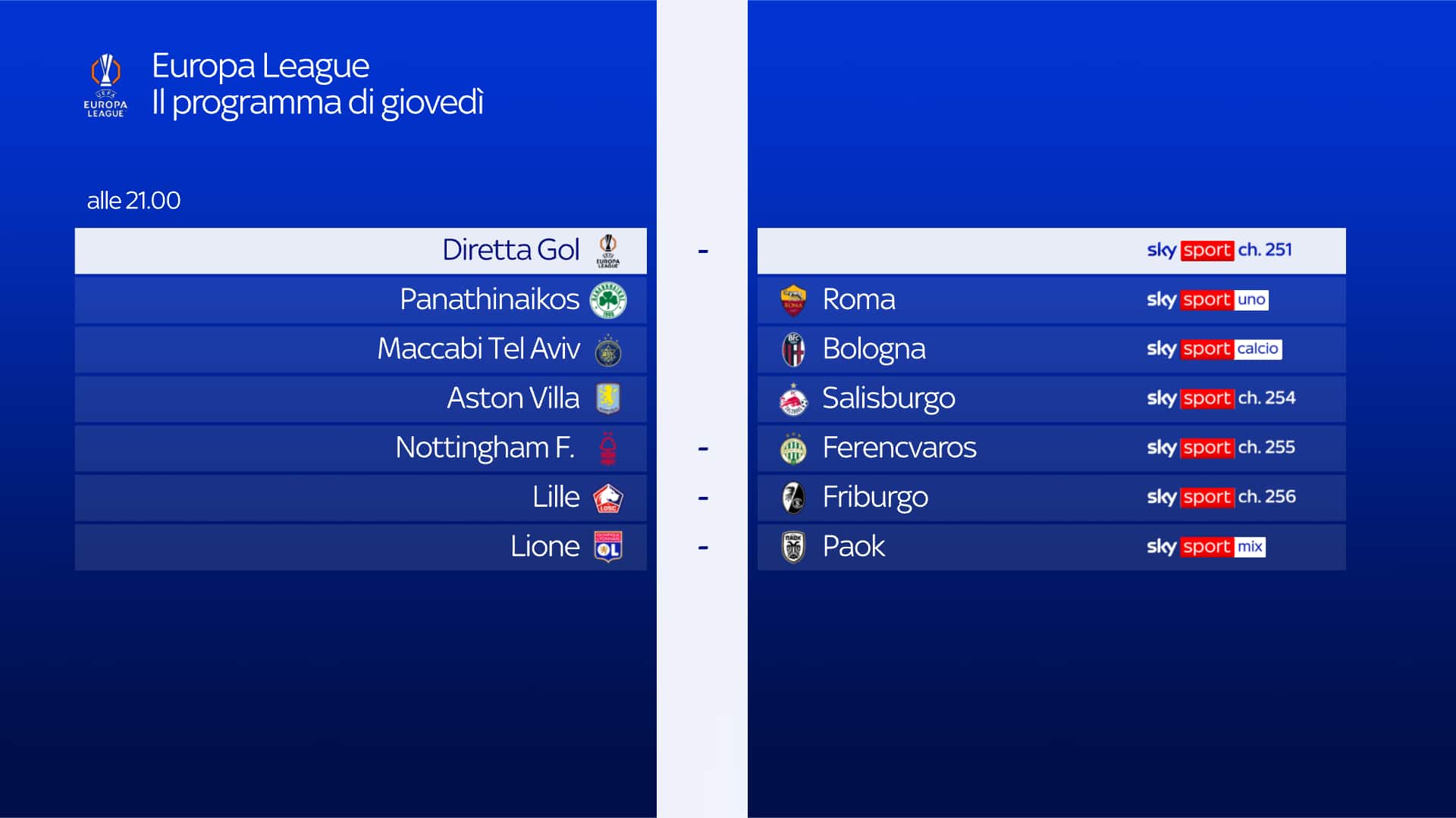 Alle 21, 18 partite da seguire anche grazie a una ricchissima Diretta Gol (Sky Sport 251), nella quale verranno implementate le grafiche con i risultati live e la classifica in continuo aggiornamento per conoscere la situazione in tempo reale delle squadre qualificate alle fasi successive del torneo. Inoltre, ampio spazio all’approfondimento pre e postpartita con Studio Europa League, il programma condotto da Mario Giunta che sarà in compagnia di Beppe Bergomi, Marco Bucciantini e Federico Zancan. Spazio news e approfondimenti affidato a Vittoria Orlando. Dalle 23.30 sarà il momento di After Party-Best of Europe, con Federica Masolin, Beppe Bergomi, Stefano Borghi, Marco Bucciantini e Lisa Offside. A mezzanotte chiude la serata Goleador Europa, il riassunto di tutti i gol segnati sui campi continentali, condotto da Martina Quaranta.
