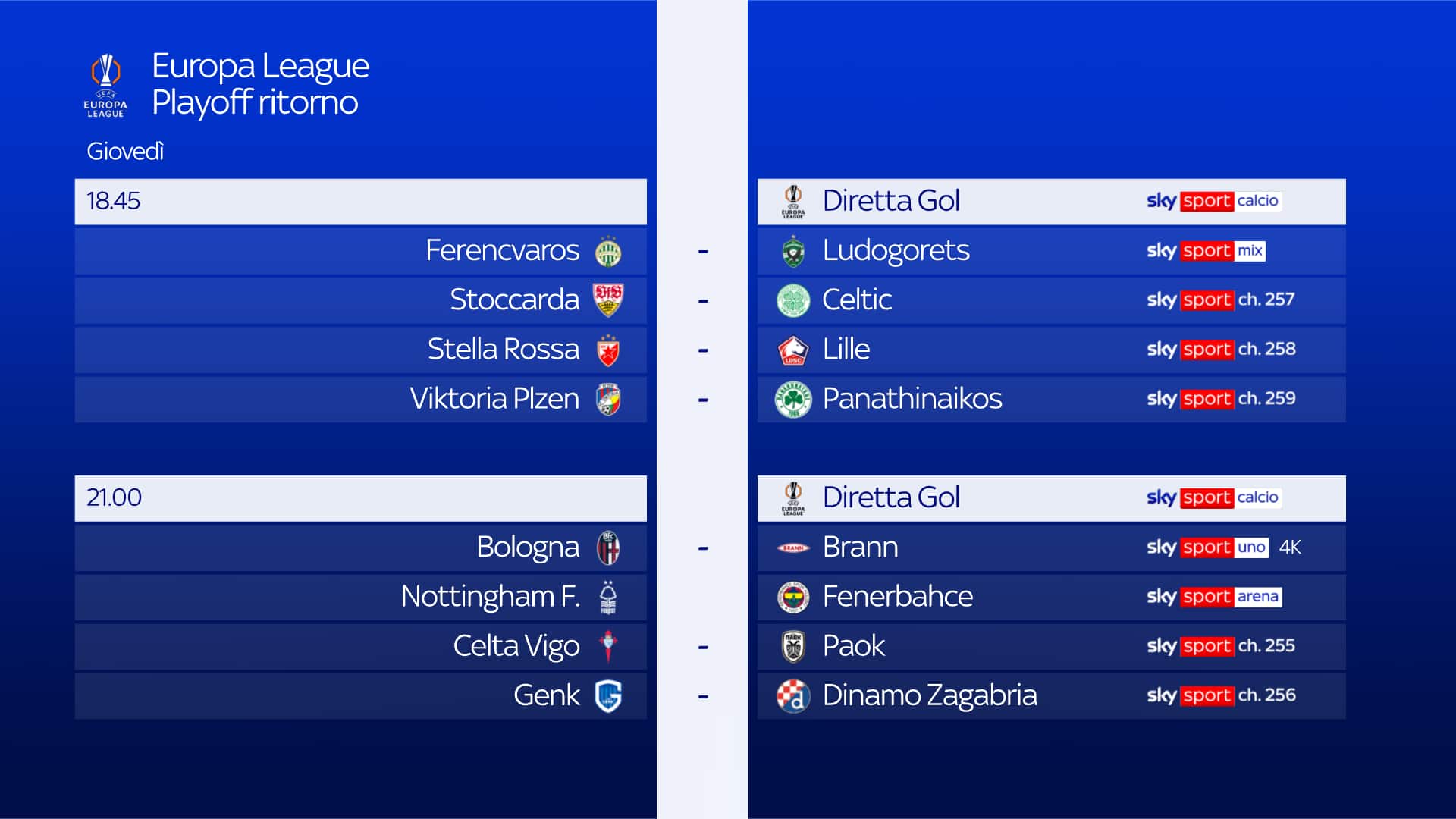 guida tvRitorno dei playoff di Europa League per il Bologna impegnato oggi alle 21 in casa contro il Brann. L’incontro sarà visibile su Sky Sport Uno, Sky Sport 252 e su NOW. Appuntamento anche con Diretta Gol alle 18.45 e 21 su Sky Sport Calcio e Sky Sport 251