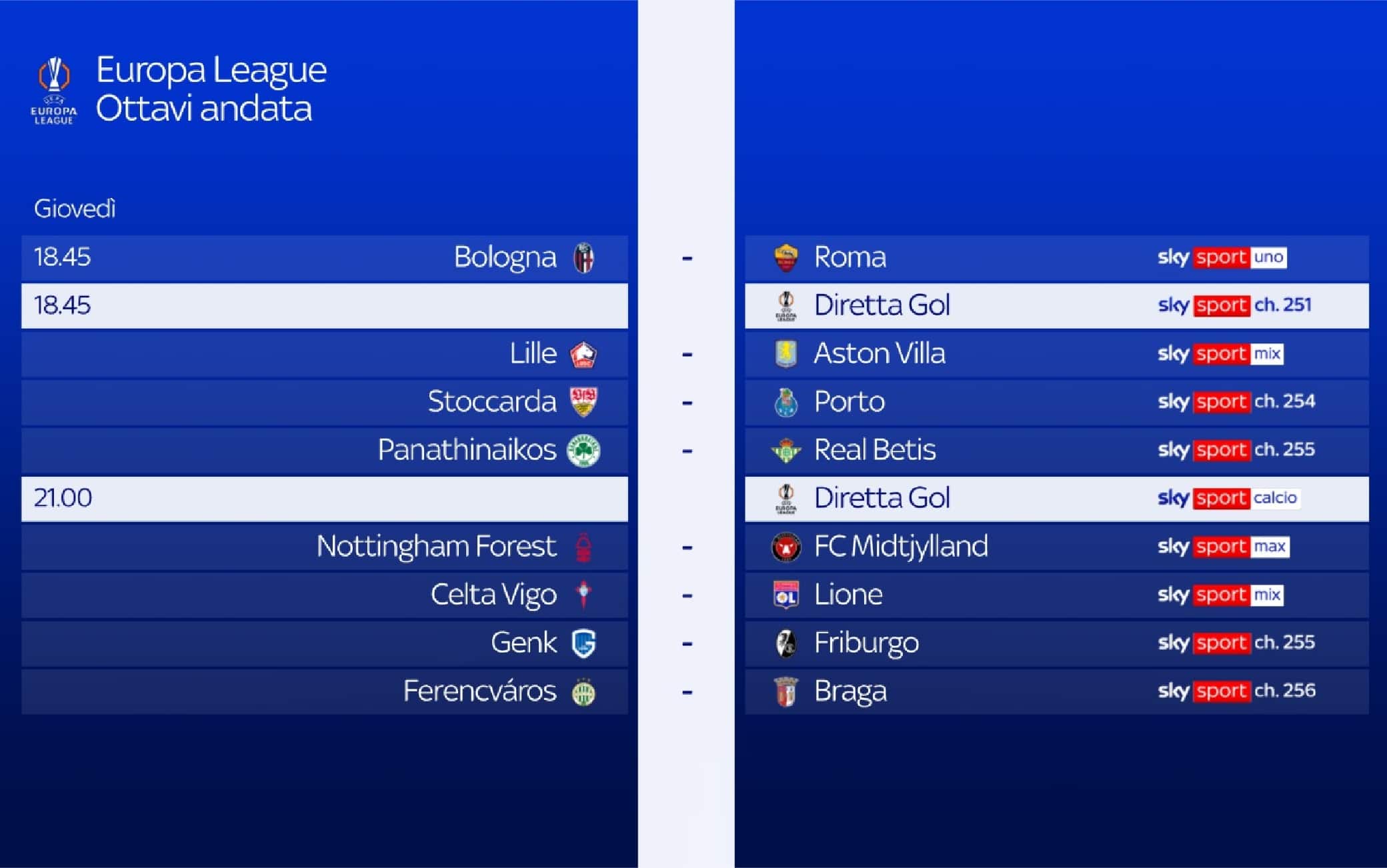 - alle 18.45: LILLE-ASTON VILLA su Sky Sport Mix e Sky Sport 253. Telecronaca Federico Botti, Diretta Gol Federico Zancan