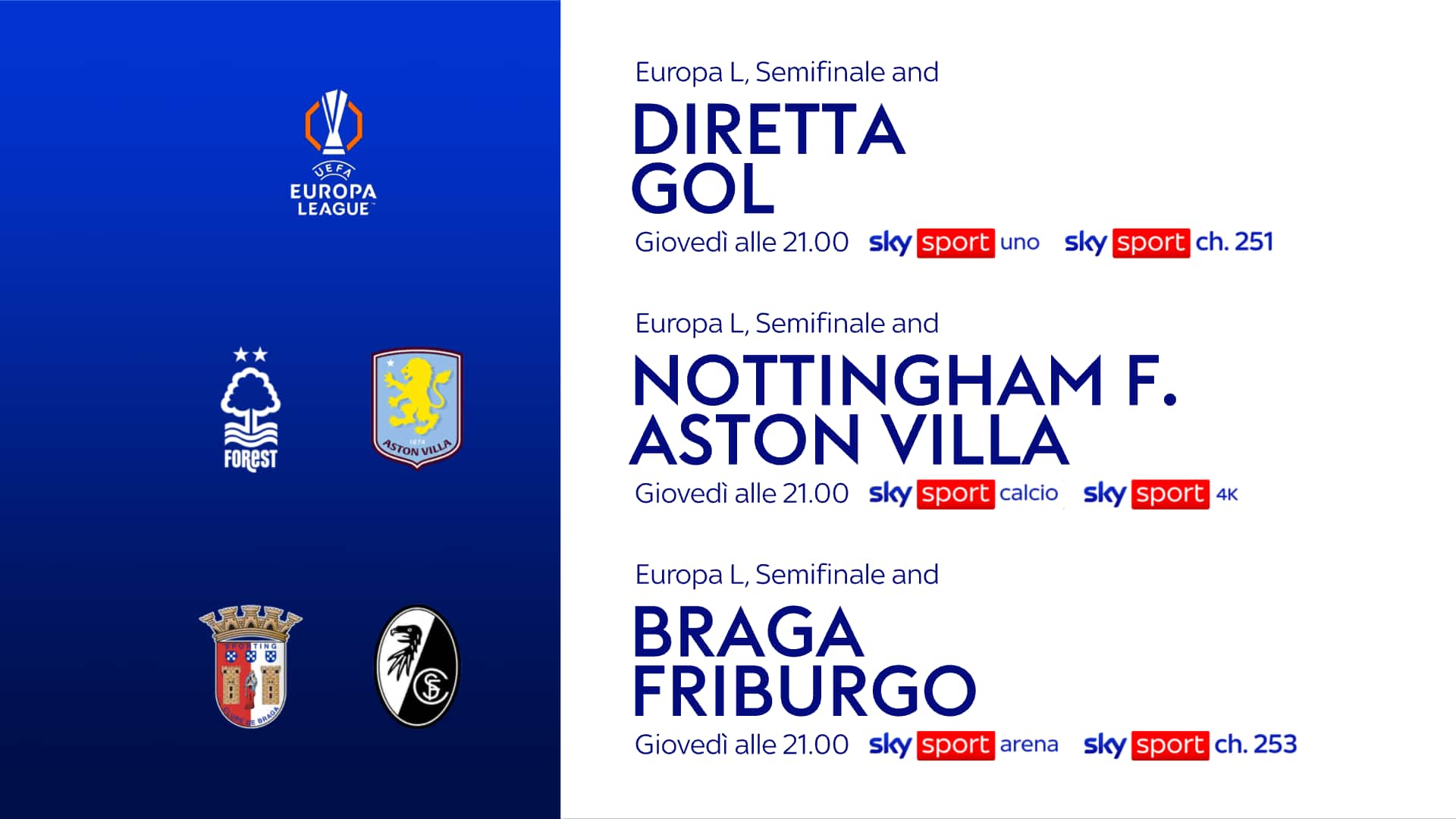 Oggi alle ore 21 appuntamento da non perdere con Braga-Friburgo per la semifinale d'andata di Europa League. L’incontro sarà visibile su Sky Sport Arena, Sky Sport 252 e in streaming su NOW. Telecronaca Elia Faggion, Diretta Gol Daniele Barone. Ampio spazio all’approfondimento pre e postpartita - dalle 20 e dalle 23- con lo Studio Europa League, il programma condotto da Mario Giunta che sarà in compagnia di Beppe Bergomi, Veronica Baldaccini e Marco Bucciantini. Spazio news e approfondimenti affidato a Vittoria Orlando. Dalle 23.45 sarà il momento di After Party-Best of Europe, con Federica Masolin, Fabio Caressa, Beppe Bergomi, Stefano Borghi e Lisa Offside. A mezzanotte chiude la serata Goleador Europa, il riassunto di tutti i gol segnati sui campi continentali, condotto da Martina Quaranta. Inoltre, alle 21 appuntamento anche con Diretta Gol su Sky Sport Uno e Sky Sport 251.