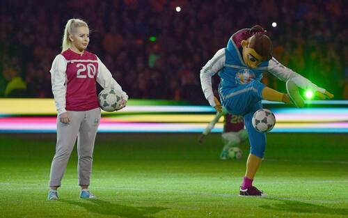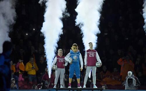 Di fronte ai 55mila di Amsterdam ha fatto il suo debutto la mascotte del prossimo Europeo: Skillzy, un omaggio al mondo del freestyle e dello street football (Foto UEFA.com)