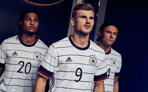 GERMANIA. Un look moderno per la maglia casalinga dei tedeschi, bianca con gessati orizzontali che coprono la parte anteriore e le maniche. Analogamente alle altre nuove divise promosse da Adidas, le strisce orizzontali presentano un sottile effetto a pennello