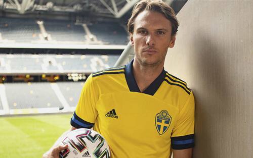 Il colletto, proprio come i polsini delle maniche sono blu scuro. Una striscia blu reale attraversa il centro dei polsini, mentre "Sverige" è scritto nella parte superiore della maglia