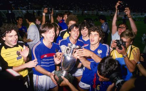 Allez les Bleus, trionfa il blu di Platini e compagni con un'altra maglia rimasta nel mito. Dettagli in bianco e rosso con le linee orizzontali davanti e sulle maniche e il logo con il galletto sul petto. La Spagna torna in finale dopo il trionfo del 1964, ma questa volta veste il rosso e perde