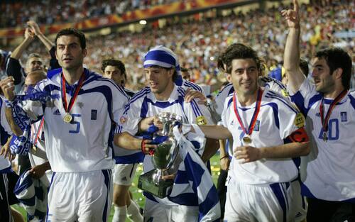 Maglia bianca con dettagli blu e una piccola bandiera della Grecia sul petto: battuto in finale il rosso dei portoghesi
