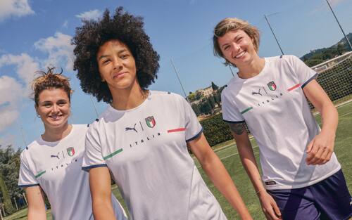DOMINA IL BIANCO - La maglia mostra sulla parte frontale la scritta 'Italia' e i colori della bandiera, in una grafica vivace e brillante accompagnata dal logo FIGC posizionato centralmente con il Puma Cat.