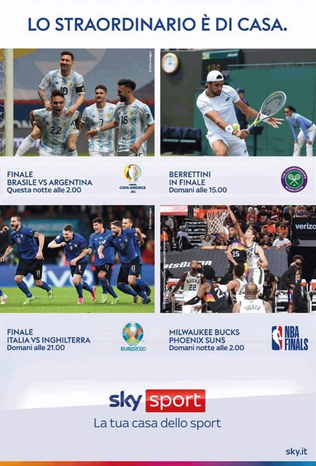Domenica 11 luglio sarà una giornata da ricordare per lo sport su Sky: in poco meno di 24 ore, il meglio del calcio, del tennis e del basket mondiale scende in campo per quattro sfide di prestigio assoluto live su Sky e in streaming su NOW.