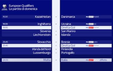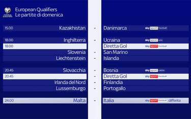 Le qualificazioni a Euro 2024 in diretta su Sky Sport. Apre la giornata la partita tra Kazakistan e Danimarca, in onda su Sky Sport Calcio. Alle 18 è il turno dell'Inghilterra che sfida l'Ucraina. In serata, in campo la Bosnia di Dzeko e il Portogallo di Cristiano Ronaldo e Leao. A mezzanotte, in differita, la gara tra Malta e Italia. Di seguito il programma completo