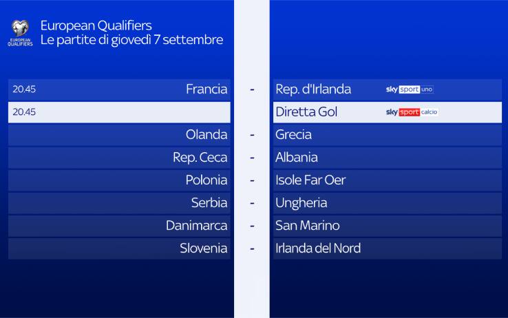 Ripartono le qualificazioni al prossimo campionato Europeo, con ben nove partite della 5^ giornata in programma quest’oggi. Tre le altre scendono in campo anche alcune big a partire dalla Francia – prima in classifica a punteggio pieno dopo i primi quattro turni – che affronta l’Irlanda nel match trasmesso in diretta su Sky Sport Uno e in straeming su NOW a partire dalle 20.45. In campo anche l'Olanda contro la Grecia, mentre la Repubblica Ceca affronta l’Albania. Il programma completo