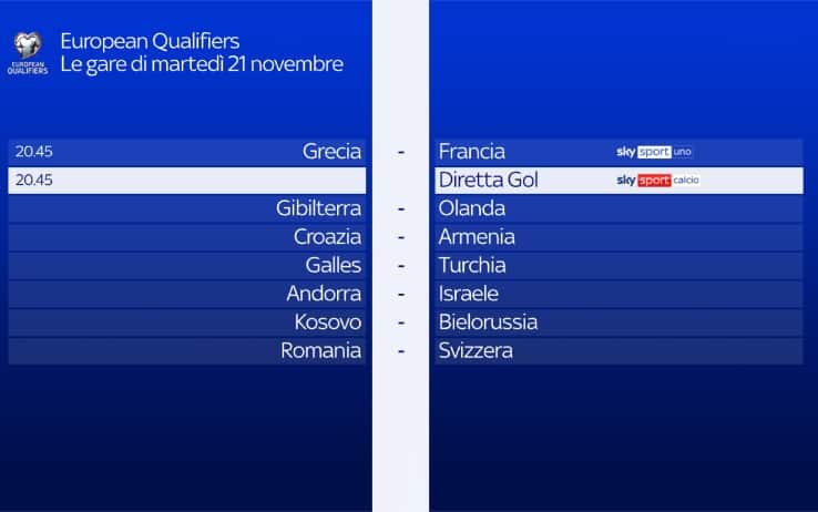 - ore 20.45: Grecia-Francia, Sky Sport Uno e in streaming su NOW. Telecronaca Andrea Marinozzi, diretta gol Paolo Ciarravano