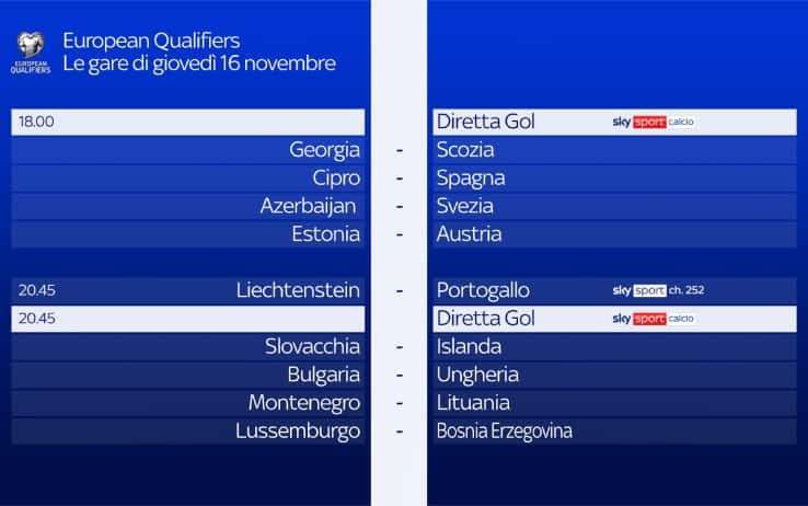 - ore 20.45: Liechtenstein-Portogallo su Sky Sport 252 e in streaming su NOW. Telecronaca di Antonio Nucera. Diretta gol Giovanni Poggi.