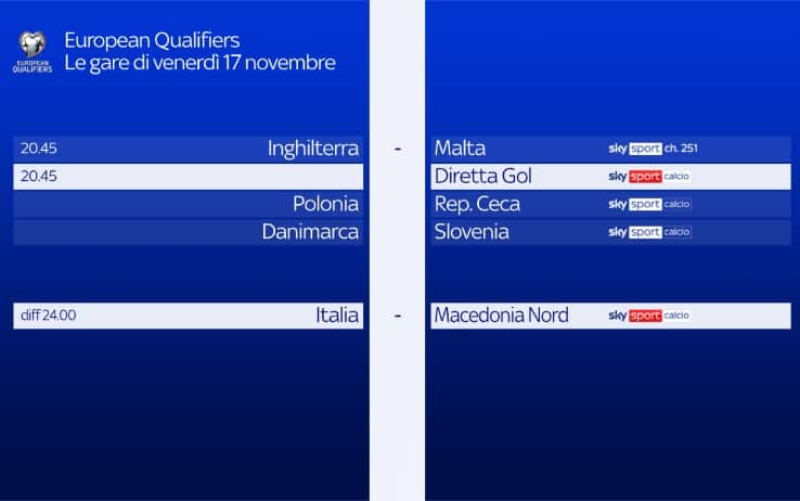 - ore 20.45: Macedonia del Nord-Inghilterra. Sky Sport Uno e in streaming su NOW. Telecronaca Federico Zancan. Diretta gol Paolo Ciarravano