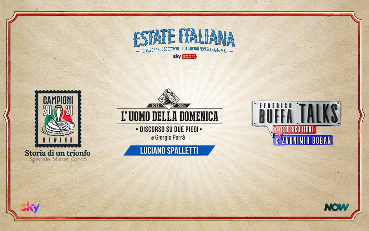 . Nei giorni in cui l’attesa per UEFA Euro 2024 entra nel vivo, tornano le Produzioni Originali di Sky Sport, in chiave europea, per rendere omaggio e celebrare l’appuntamento calcistico dell’estate. Nuovi speciali, con interviste e approfondimenti, ci accompagneranno in questo periodo: Campioni 2021 Rewind. Speciale Mister Condò: storia di un trionfo (da domani, 7 giugno); L’Uomo della Domenica - Discorso su due piedi: Luciano Spalletti, il maledetto toscano (dal 9 giugno); Storie di Europei di Federico Buffa insieme al direttore di Sky Sport Federico Ferri (dal 14 giugno); Federico Buffa Talks Zvonimir Boban (dal 21 giugno e dal 28 giugno).