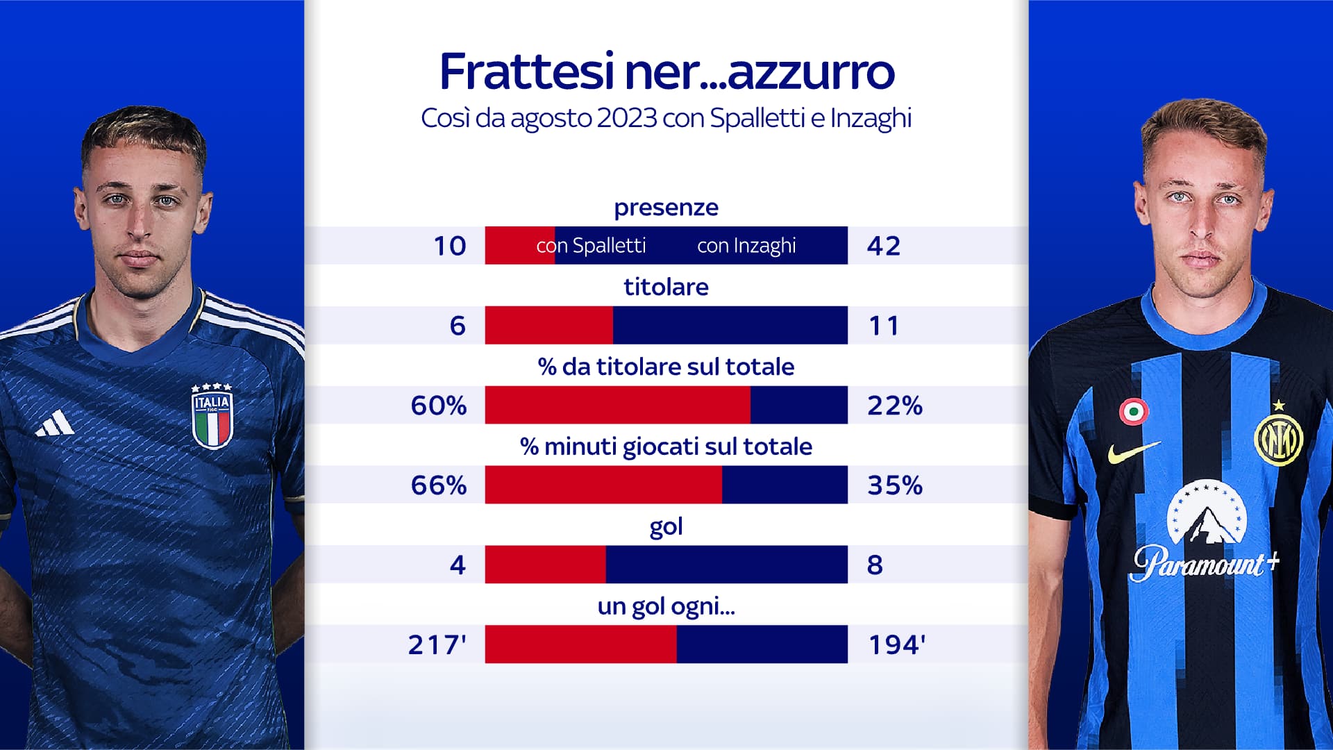 La fiducia di Spalletti, il minutaggio in azzurro superiore a quello all'Inter, modelli e il gruppo. Di questo e tanto altro ha parlato Frattesi in conferenza stampa dal ritiro tedesco dell'Italia, a tre giorni dalla seconda sfida del girone contro la Spagna. Tra i temi principali, sicuramente, la sua presenza maggiore (e con più gol) in nazionale rispetto al club e la "marcatura ad uomo" del Ct durante la prima partita: "Spalletti mi richiama spesso? La prendo bene, vuol dire che ha fiducia in me". E sul giocare meno all'Inter: "Credo non sia mai facile calarsi il primo anno in una squadra arrivata in finale di Champions, la mia gestione dia parte di Inzaghi credo sia stata giusta. Forse dovrei mettermi la maglia della nazionale sotto quella dell'Inter…" - dice ridendo.
