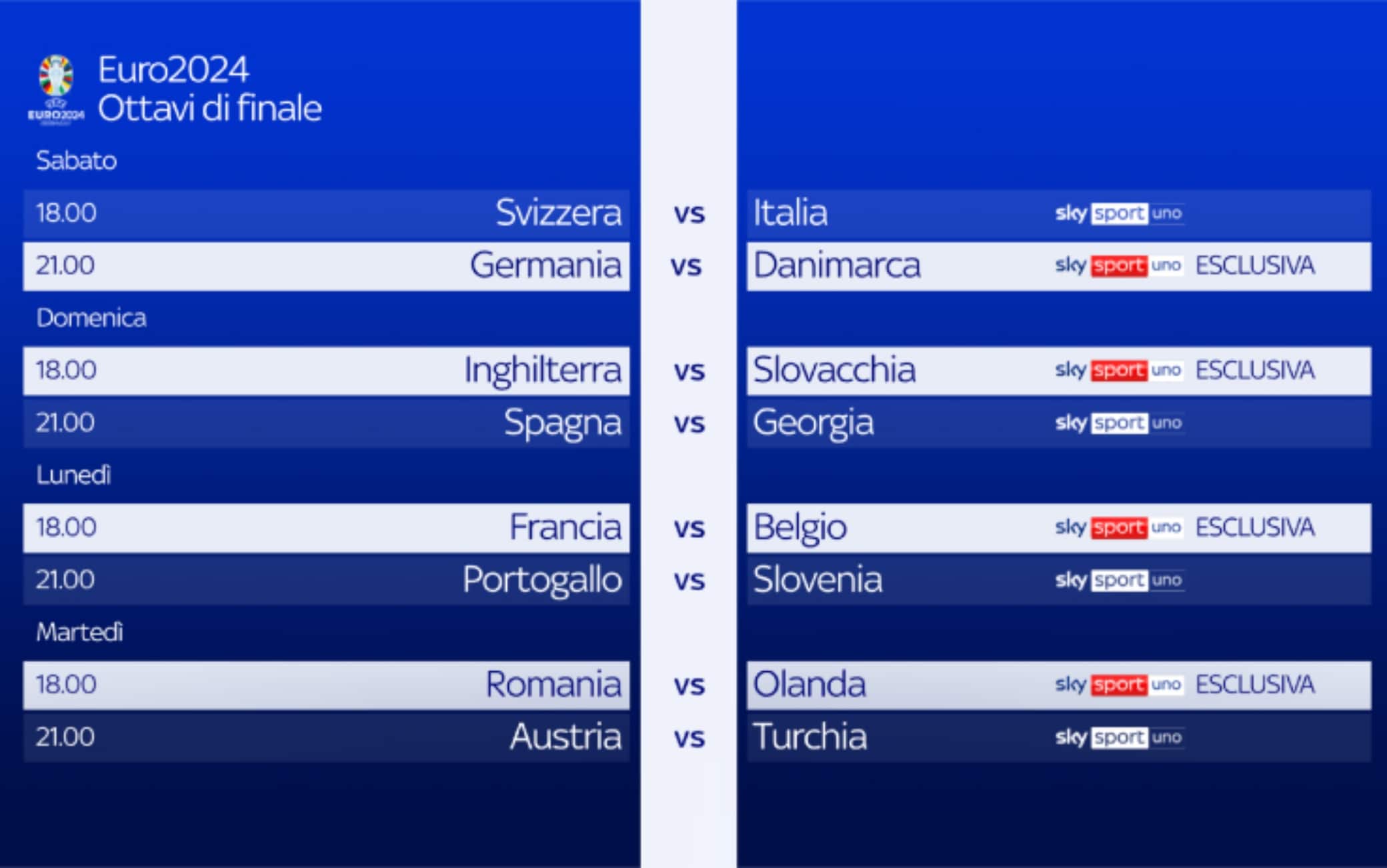 GUIDA TVIniziano gli ottavi di finale e l'Italia è subito impegnata contro la Svizzera, match live alle 18 su Sky Sport Uno, Sky Sport Calcio, Sky Sport 4K, Sky Sport 251 e in streaming su NOW. Alle 21 inizierà invece Germania-Danimarca, in diretta esclusiva sui canali Sky Sport Uno, Sky Sport Calcio, Sky Sport 4K, Sky Sport 251 e in streaming su NOW