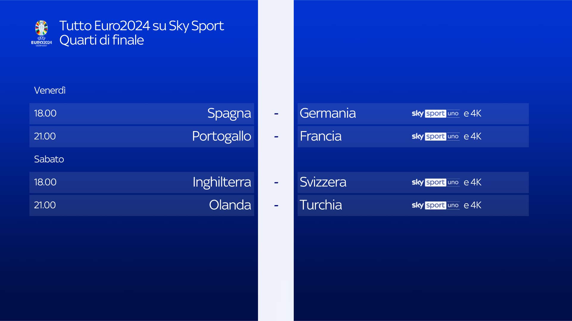 - Ore 18: SPAGNA-GERMANIA, Sky Sport Uno, Sky Sport Calcio, Sky Sport 4K, Sky Sport 251 e in streaming su NOW. Telecronaca di Federico Zancan con commento di Riccardo Montolivo. A bordocampo Niccolò Omini e Giovanni Guardalà