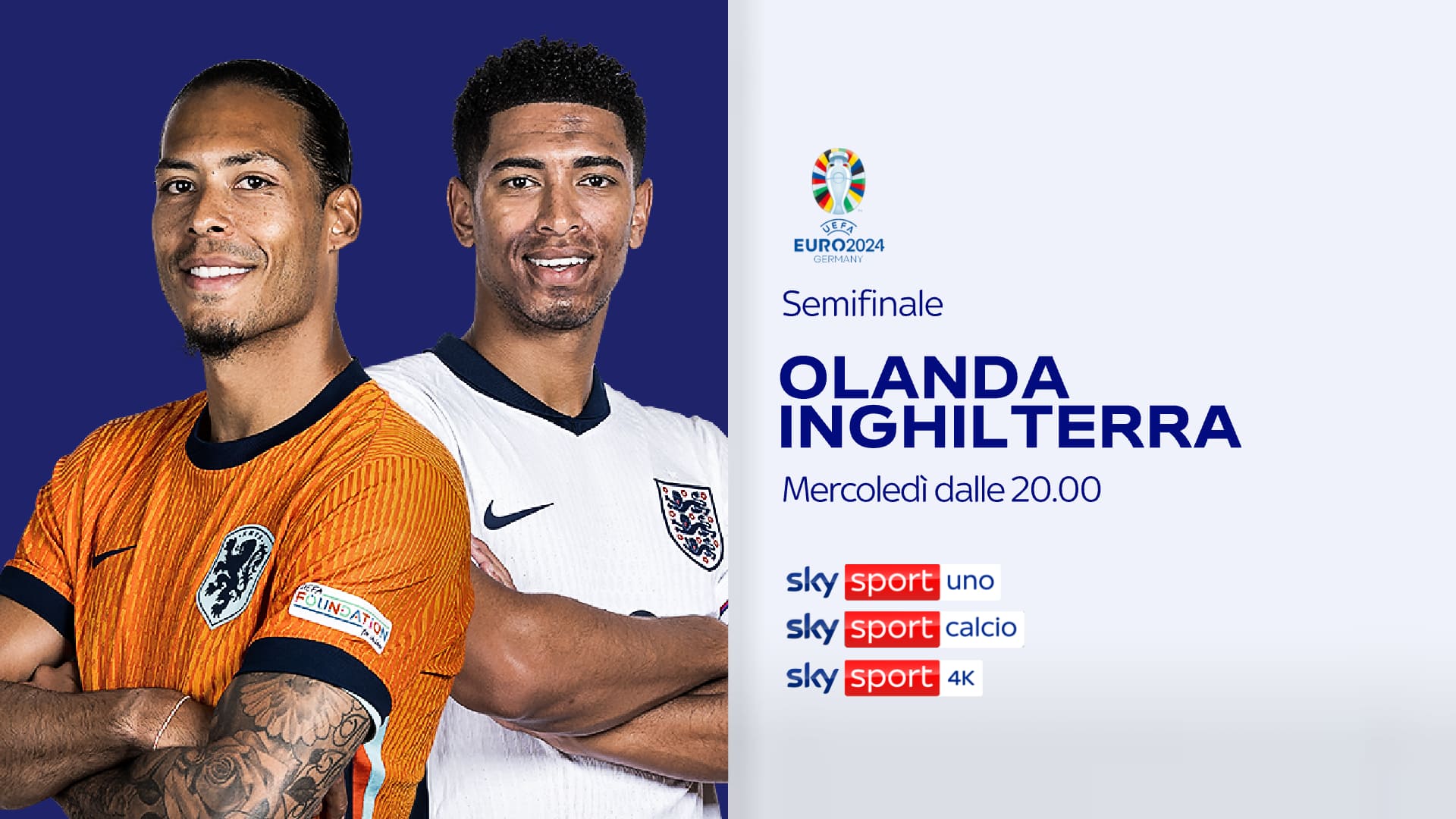 - Ore 21: OLANDA-INGHILTERRA su Sky Sport Uno, Sky Sport Calcio, Sky Sport 4K, Sky Sport 251 e in streaming su NOW. Telecronaca Massimo Marianella, commento Giancarlo Marocchi. A bordocampo Paolo Aghemo e Filippo Benincampi