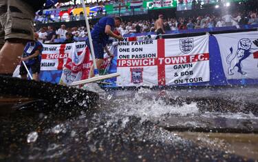 Una bomba d'acqua a Dormund prima della semifinale degli Ruropei tra Olanda e Inghilterra. Dal tetto dell stadio autentiche cascate, ma i tifosi l'hanno presa decisamente bene. E il campo ha retto perfettamente