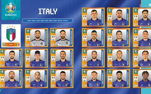 Nella collezione sono presenti le figurine di Gianluigi Donnarumma, Salvatore Sirigu, Francesco Acerbi, Alessandro Bastoni, Leonardo Bonucci, Giorgio Chiellini, Emerson, Alessandro Florenzi, Nicolò Barella, Jorginho, Manuel Locatelli, Lorenzo Pellegrini, Marco Verratti, Andrea Belotti, Domenico Berardi, Federico Bernardeschi, Federico Chiesa, Ciro Immobile, Lorenzo Insigne e Moise Kean