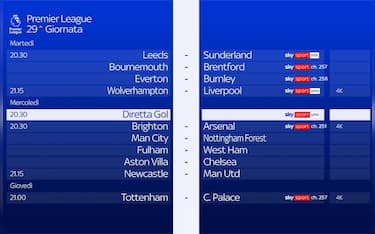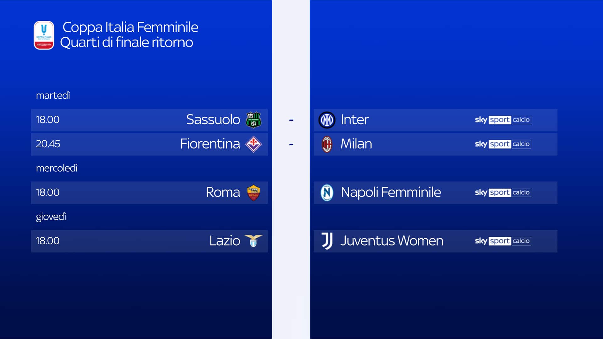 Tutte live e in esclusiva su Sky e NOW le sfide di ritorno dei quarti di finale. Oggi Sassuolo-Inter alle 18 (Sky Sport Uno, Sky Sport Calcio e NOW) e Fiorentina-Milan alle 20.45 (Sky Sport Calcio e NOW). Mercoledì 29 gennaio Roma-Napoli alle 18 (Sky Sport Calcio e NOW) e giovedì 30 gennaio Juventus-Lazio alle 18 (Sky Sport Uno, Sky Sport Calcio e NOW)