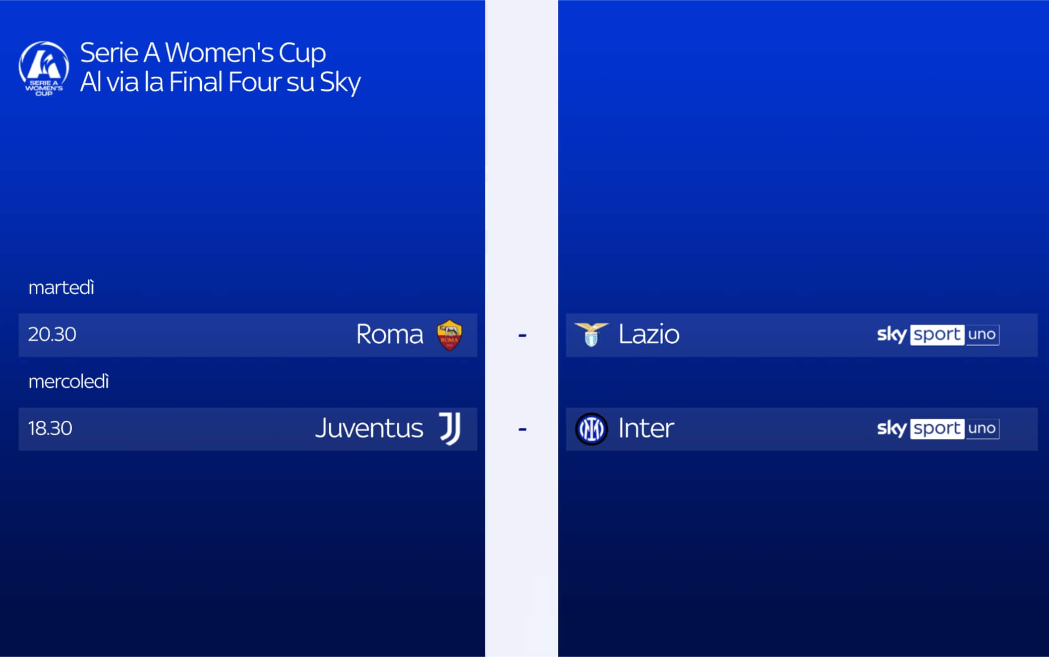 Appuntamento mercoledì 24 alle 18.30 per Juventus e Inter (telecronaca Gaia Brunelli e Rita Guarino, inviato Francesco Modugno). La semifinale sarò trasmessea in diretta su Sky Sport Uno e in streaming su NOW. La finale si giocherà sabato 27 settembre alle 17.30, sempre in diretta su Sky e NOW.