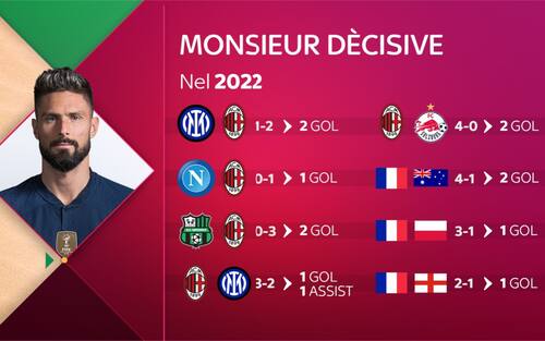 Un 2022 da uomo decisivo per l’attaccante francese, protagonista con le sue reti sia nel Milan che in nazionale. Gol pesanti, che sbloccano o ribaltano partite: l’ultimo è quello che ha portato la Francia in semifinale, cancellando l’etichetta di “9 che non segna” di un Mondiale fa