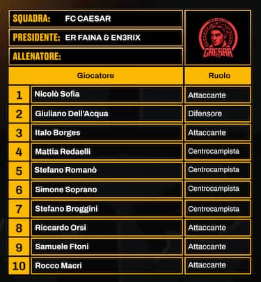 I Caesar sono la squadra di Damiano Er Faina ed Enerix. La loro prima scelta è stata Nicolò Sofia (attaccante, 78 di overall), per poi spostarsi sulla difesa con Giuliano Dell'Acqua (difensore, 81 di overall). Poi, Italo Borges (attaccante, 80 di overall), seguito da Mattia Redaelli (centrocampista, 81 di overall), Stefano Broggini (centrocampista, 79 di overall), Simone Soprano (centrocampista, 79 di overall), Federico Praglia (difensore, 79 di overall), Riccardo Orsi (attaccante, 78 di overall), Samuele Ftoni (attaccante, 76 di overall) e Rocco Macri (attaccante, 71 di overall). Da sottolineare la presenza di Paolo Bonolis come direttore sportivo.