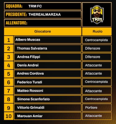 La rosa dei TRM di Francesco Marzano (conosciuto come TheRealMarzaa) è composta da Alberto Muscas (centrocampista, 79 di overall), Thomas Salvaterra (difensore, 82 di overall), Andrea Filippi (difensore, 78 di overall), Denis Andrei (attaccante, 78 di overall), Andres Cordova (attaccante, 79 di overall), Federico Turati (centrocampista, 75 di overall), Matteo Rossoni (attaccante, 80 di overall), Simone Scanferlato (centrocampista, 75 di overall), Vittorio Grimaldi (portiere, 71 di overall) e Marouan Amiar (attaccante, 75 di overall).