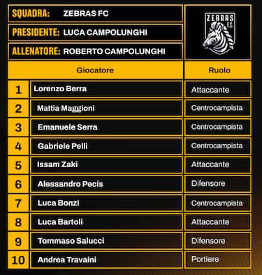 Gli Zebras hanno annunciato le loro tre wild card: Andrea Tarasco, Riccardo Villa e Antonio Iuliano. Il primo è un difensore che, come spiegato anche nel post diffuso dalla squadra di Campolunghi, sarà il "faro della difesa" degli Zebras. Dalla difesa all'esterno, con Riccardo Villa che approda in Kings League Italy dopo le esperienze raccolte in Serie D con le maglie di Lumezzane, Real Calepina, Brusaporto e Adrense. L'ultima wild card è il portiere Antonio Iuliano (conosciuto sui social come 'The_instakeeper'). "Annunciamo finalmente il nostro numero 1, colui che difenderà i nostri pali, il nostro muro, il presidente lo ha voluto dal giorno 0. Un portiere che non ha bisogno di presentazioni", ha scritto sui social la squadra di Campolunghi.