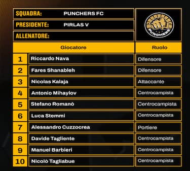 Spazio ora ai Punchers. La squadra dei PirlasV (Pierino e Gnabri) è composta da Riccardo Nava (difensore, 80 di overall), Fares Shanableh (difensore, 81 di overall), Nicolas Kalaja (attaccante, 81 di overall), Antonio Mihaylov (centrocampista, 73 di overall), Stefano Romanò (centrocampista, 74 di overall), Luca Stemmi (centrocampista, 79 di overall), Alessandro Cuzzocrea (portiere, 78 di overall), Davide Tagliente (centrocampista, 75 di overall), Manuel Barbieri (centrocampista, 76 di overall) e Nicolò Tagliabue (centrocampista, 74 di overall).