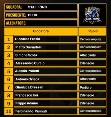 E' il momento degli Stallions di Gianmarco Tocco (conosciuto come Blur). La rosa è composta da Riccardo Frosio (centrocampista, 83 di overall), Pietro Brusadelli (centrocampista, 81 di overall), Simone Soldà (attaccante, 77 di overall), Alessandro Curcio (difensore, 75 di overall), Alessio Proietti (centrocampista, 80 di overall), Antonio Orteca (attaccante, 78 di overall), Gianluca Bressan (portiere, 77 di overall), Francesco Iori (difensore, 76 di overall), Filippo Adamo (difensore, 73 di overall) e Ferdinando Pannuti (centrocampista, 76 di overall).