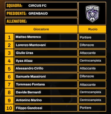 La prima scelta di Simone Buratti (conosciuto come GrenBaud) per la sua squadra, i Circus, riguarda la porta con Matteo Marenco (portiere, 77 di overall). Subito dopo Lorenzo Mantovani (difensore, 80 di overall), Giulio Uras (attaccante, 82 di overall), Ilyas Afzaz (centrocampista, 77 di overall), Alessandro Cirillo (attaccante, 77 di overall), Samuele Massironi (difensore, 76 di overall), Tommaso Fontana (attaccante, 81 di overall), Davide Bernardi (centrocampista, 76 di overall), Antonino Marino (centrocampista, 71 di overall) e Filippo Gandossi (portiere, 72 di overall).